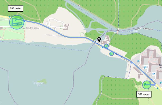 området. De grønne cirkler er gratis parkering, og de blå ruter er vejen dertil. Den sorte markør er bådudlejningens lokation, og afstande er fra bådudlejningen til parkeringspladsen.